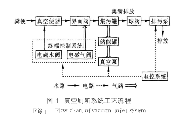 真空廁所係統由真空站 、管網 、真空便器組成 。真空站內的主要設備有 :1個真空集汙罐 ,用來存放臨時汙水, 罐內設有料位計;1個真空儲能罐,其中分為控製腔室和執行腔室, 控製腔室為真空界麵閥的打開提供穩定的動力, 保證控製氣路中的負壓大於真空界麵閥開啟所需負壓 , 執行腔室起儲能罐的作用 ,既可減少霧汽、雜物進入真空泵, 又可儲備真空能量 ;2台水環真空泵 ;1個循環水箱,為水環泵提供水源 ,並將真空泵排出的臭氣過濾排出 ;1台排汙泵 ,用於將真空集汙罐中的汙水排入化糞池;1個電控櫃,起主控作用 ;8個終端控製盒, 盒內以時間繼電器、繼電器等電氣元件組成,用於控製電磁閥和真空界麵閥的啟閉 ;1台備用發電機 ,用於停電事
