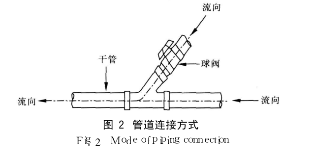真空界麵閥與支管通過活結頭相接 , 支管與幹管之間通過活結式球閥相接 ,以便於檢修。為減小幹管工作對主幹管主流的影響 , 應采用順水三通(也稱 Y型三通, 見圖 2)連接 ,同時幹管應從主幹管上部接入 , 避免使用 90°正三通直接連接主幹管。管道間采用承插和法蘭相連接。